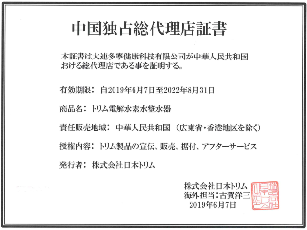 大连多宁健康科技有限公司是日本TRIM整水器在中国的独占总代理。